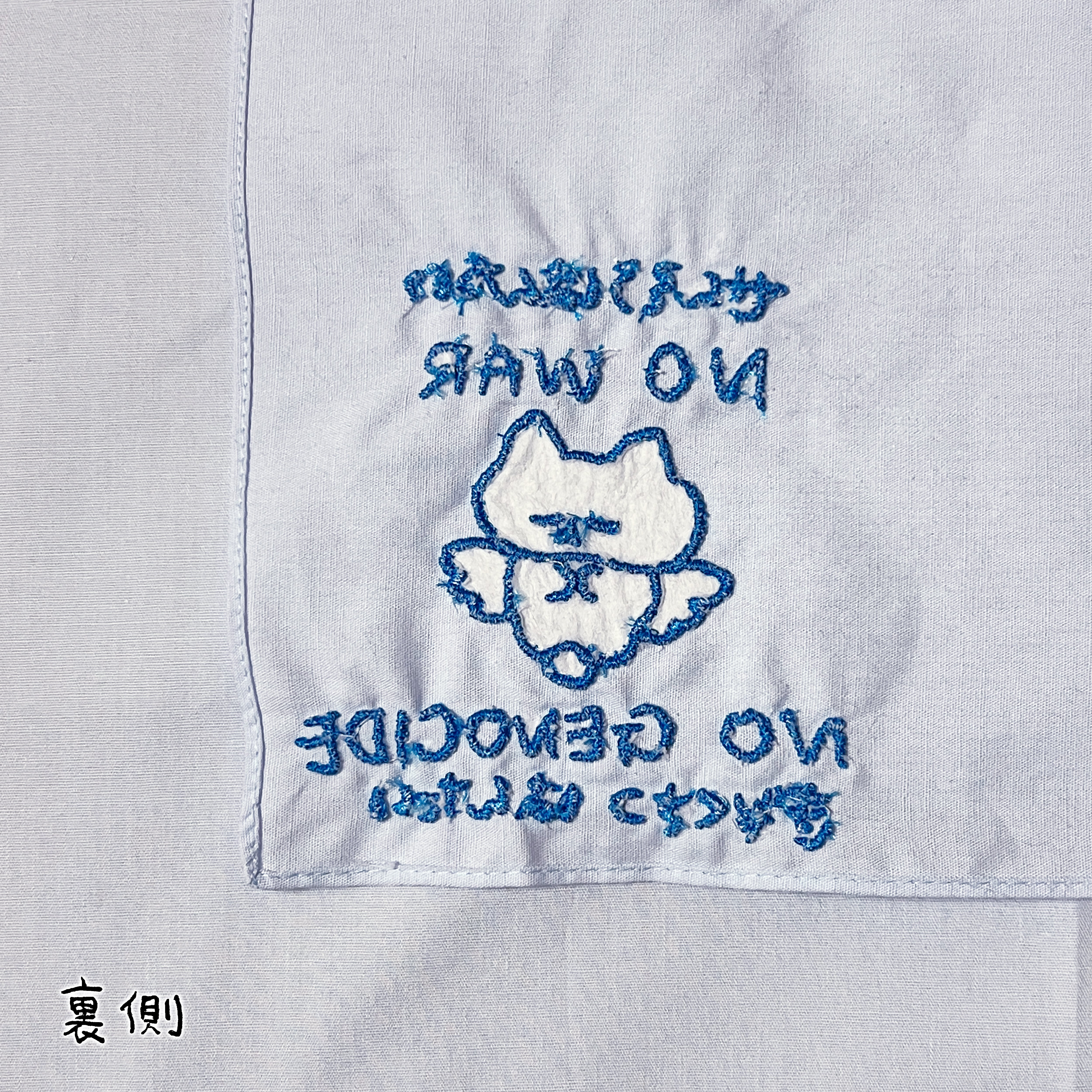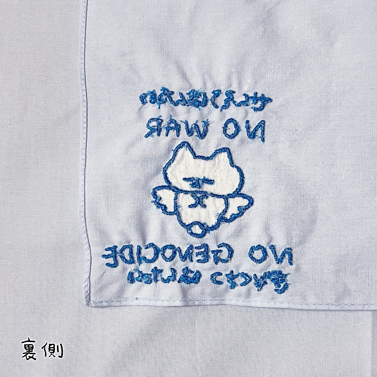 「せんそうはんたい、ぎゃくさつはんたい」のメッセージとねこの絵が刺繍されたハンカチです。