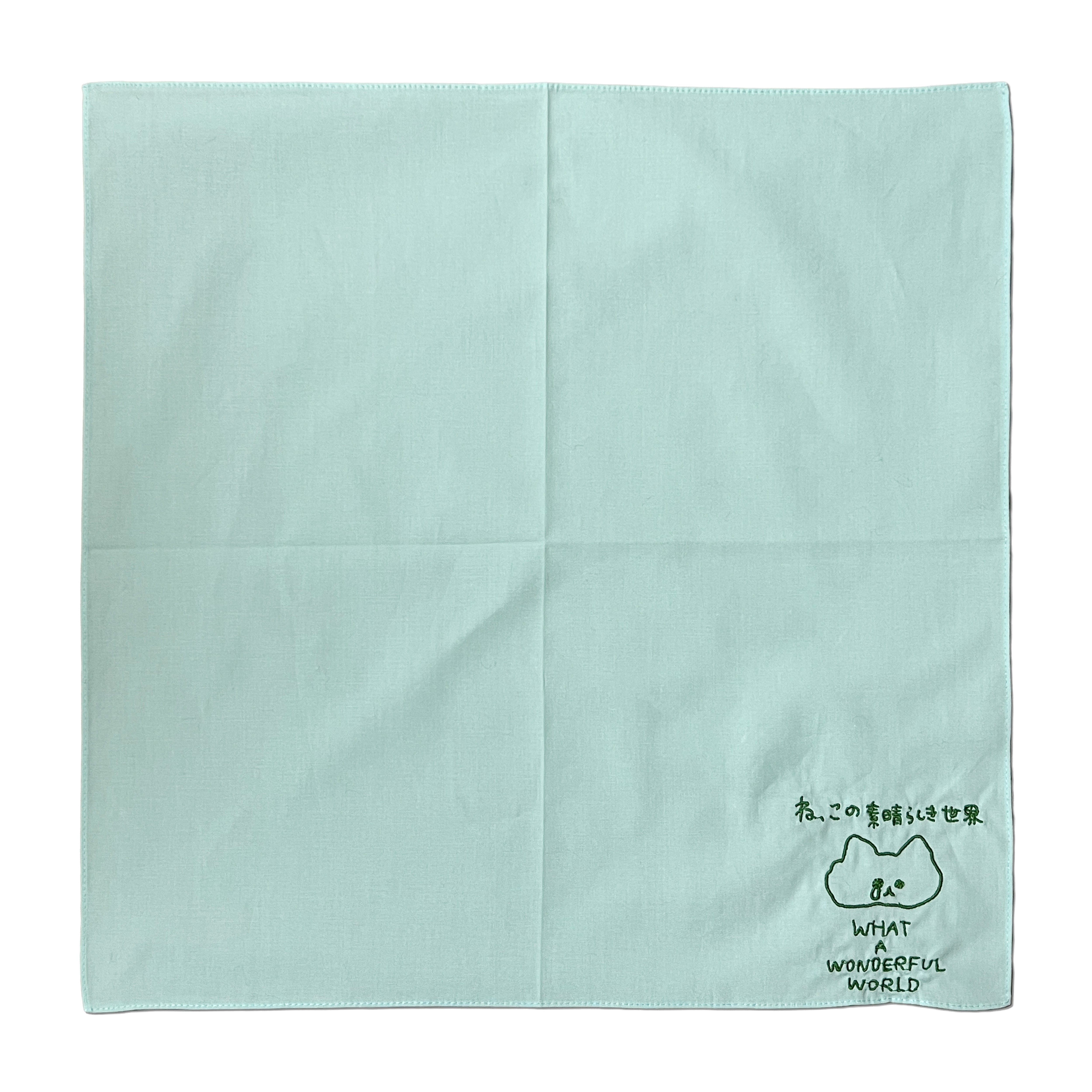 「ね、この素晴らしき世界」のメッセージとねこの絵が刺繍されたハンカチです。