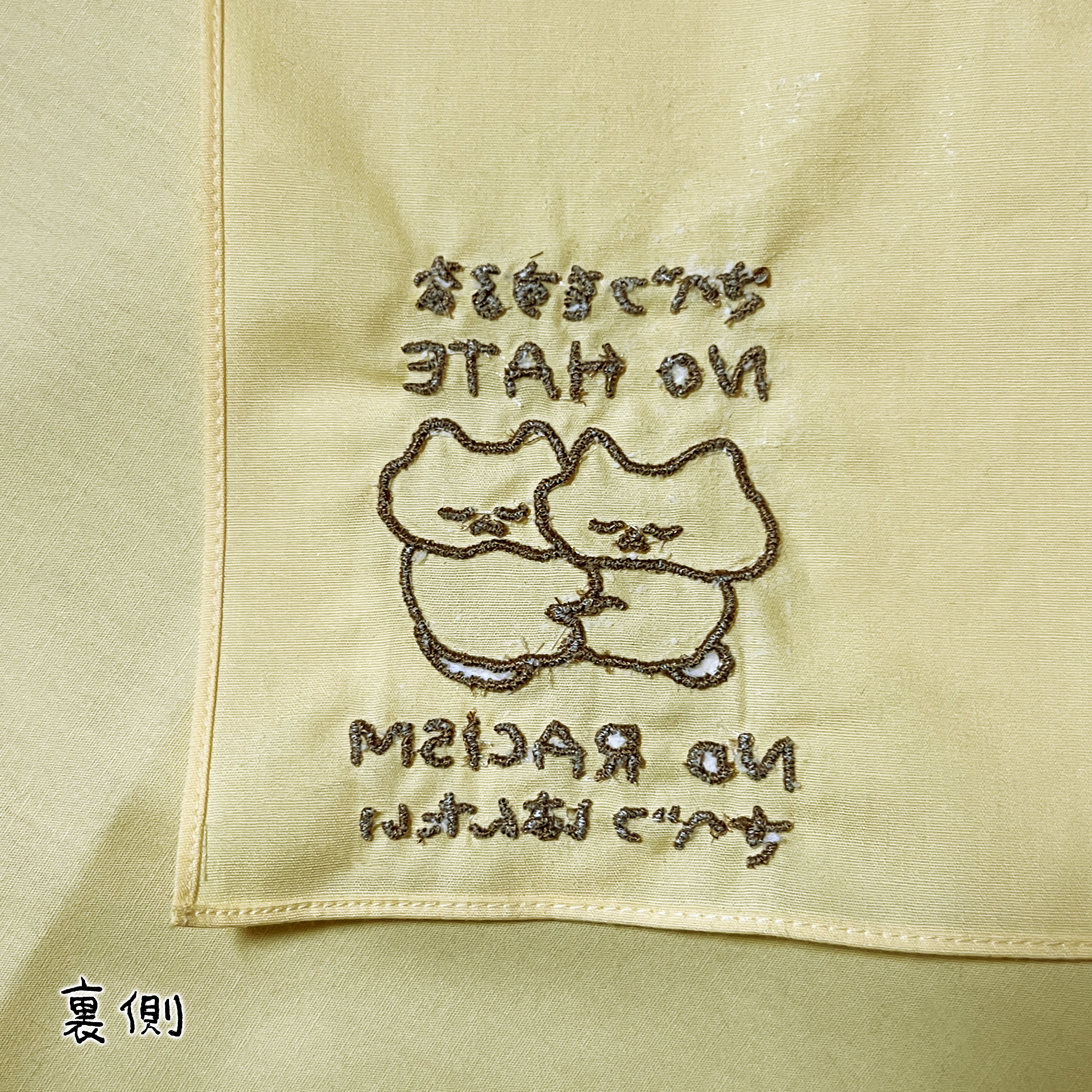 ねこのメッセージ刺繍ハンカチ (さべつするな、さべつはんたい)