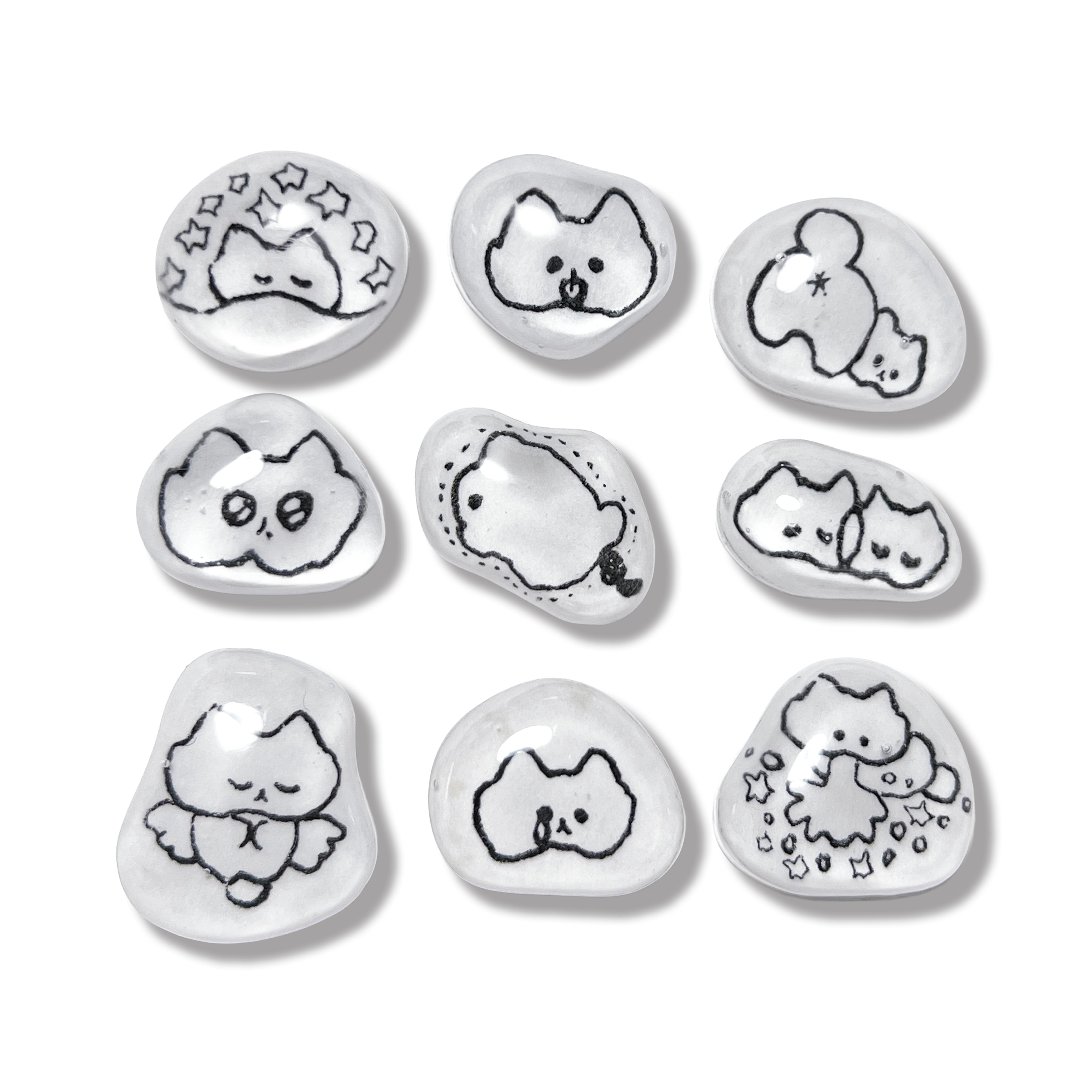 ねこの絵がプリントされたちいさなてづくりマグネットです。