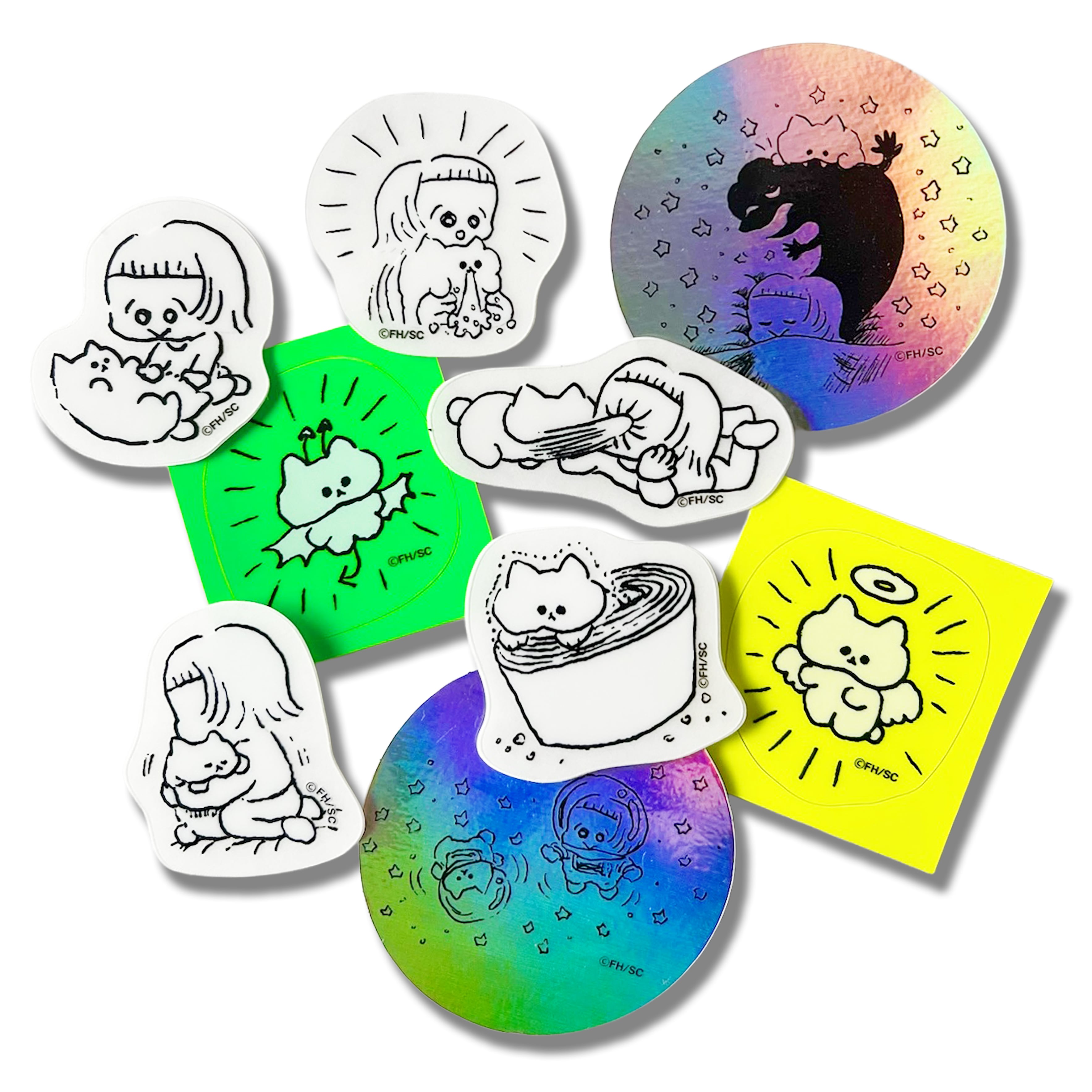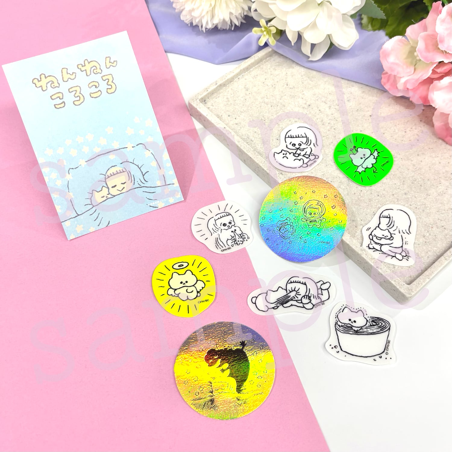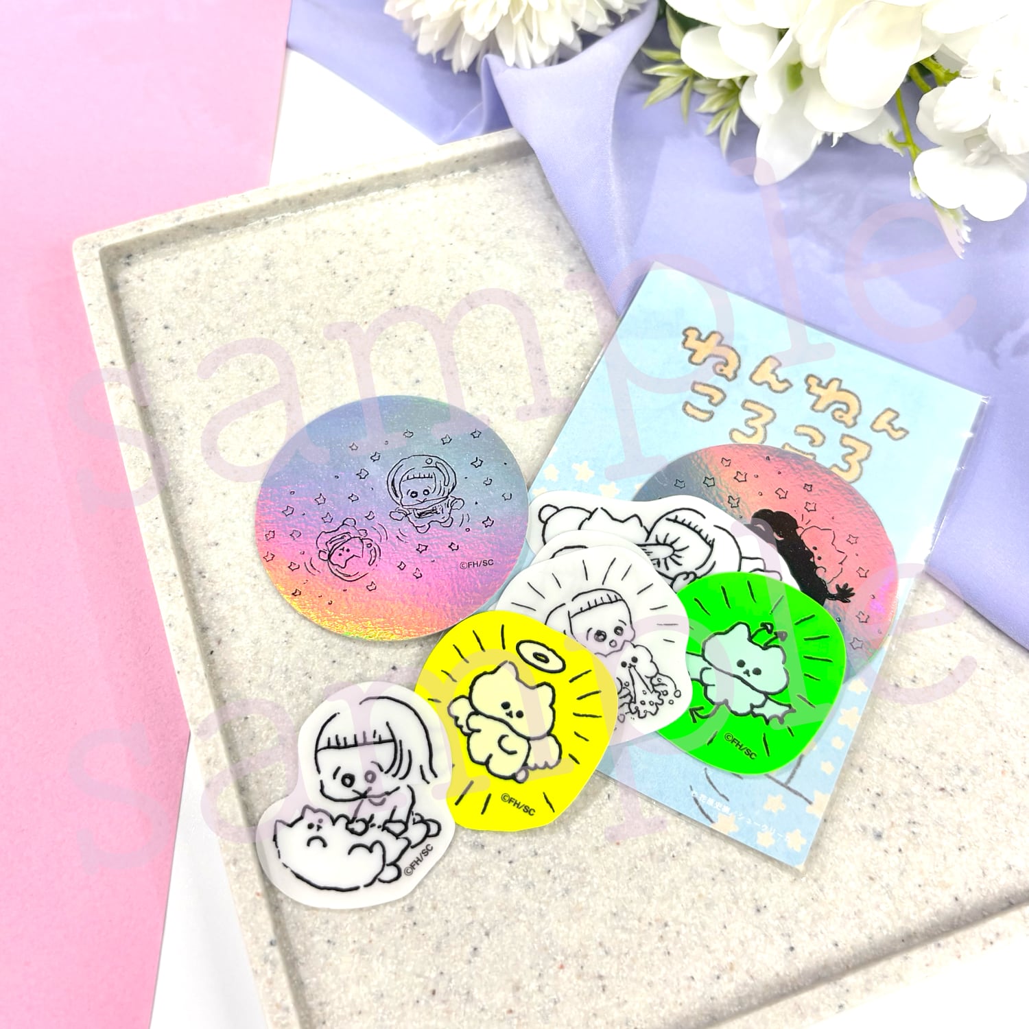 OUR FEEL (https://ourfeel.jp) で連載中のまんが『ねんねんころころ』より、みいちゃんとおころりちゃんの絵がプリントされたフレークシールです。