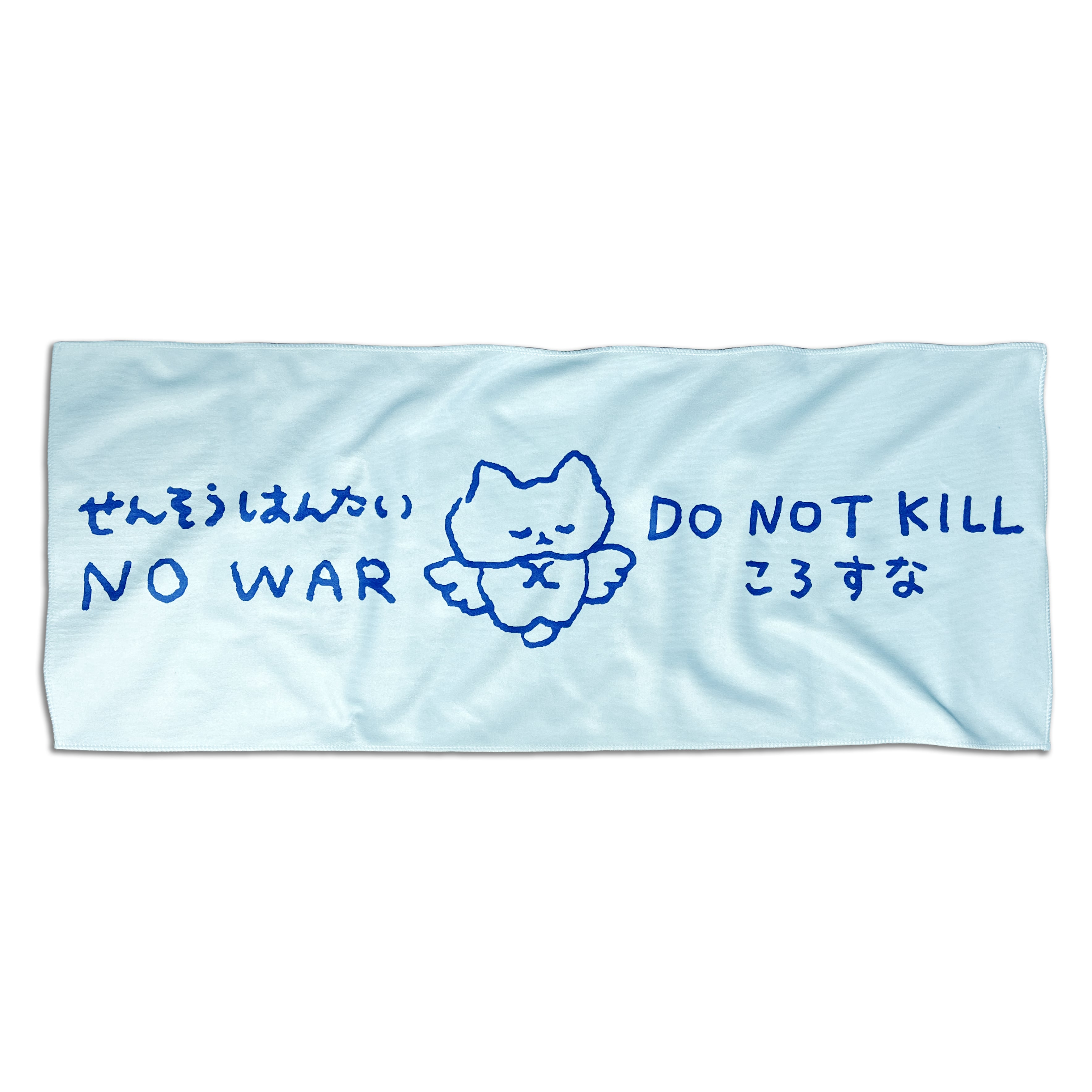 「せんそうはんたい、ころすな」のメッセージとねこの絵がプリントされたフェイスタオルです。
